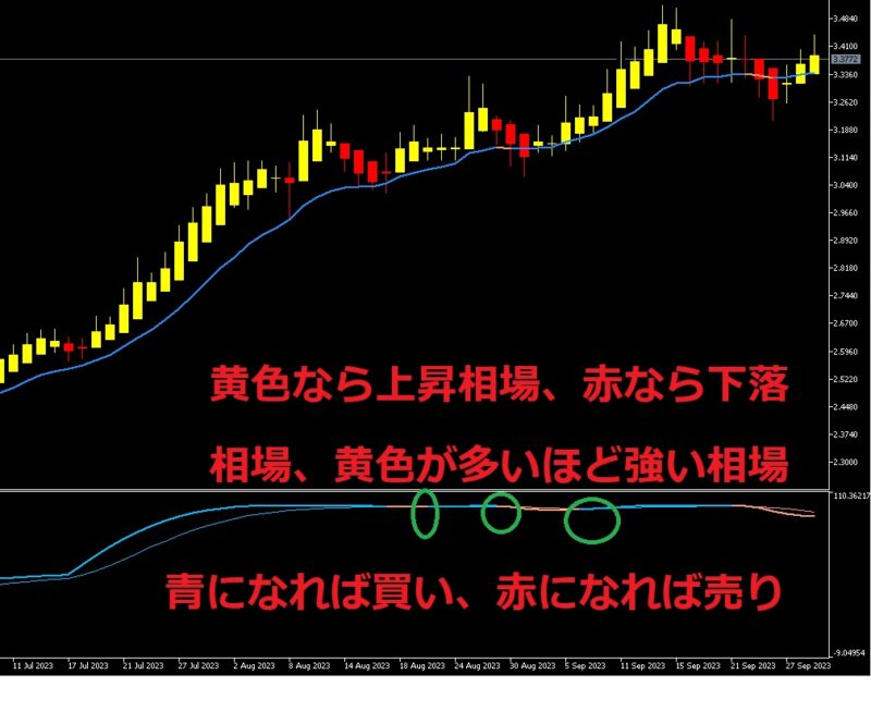黄色になっているバーは価格の上昇を表しています。赤色は下落を表しています。例えば画像の例では黄色のバーの数が多いので「上昇傾向」にあるといえます。