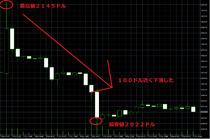 12月4日の金相場はその後のアメリカ時間にさらなる下落となりました。一時は最高値2145近くまで上昇したものの、その後は売りの圧力に負け日本時間夜の23時ごろには、一気に最高値より100ドル近くの2022ドルまで下落しました。