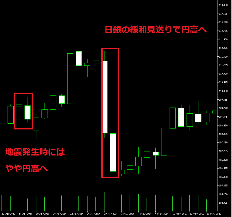 この時には震度7の地震がありましたが、一時的な円高にとどまっています。値動きとしては1円以上の110円台から108円台です。