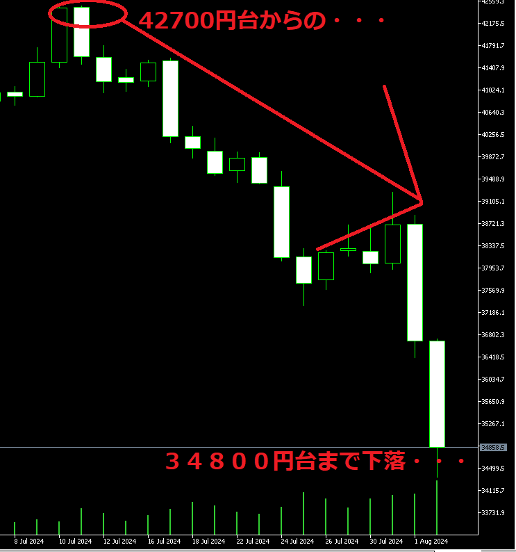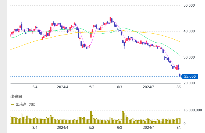6月の頭には4万円台ですが、8月の2日には22600円台まで下落しています。