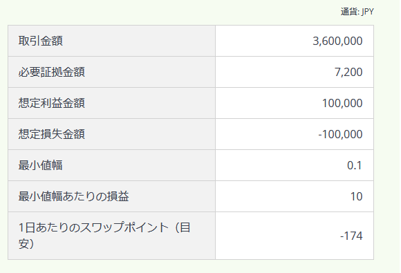 先の画像の例ですと、一日のスワップポイントがマイナスとなっています。1単位でー12円のコストが掛かるということは、100倍の単位を購入すると一日で-1200円近くのコストが掛かる計算になります。(価格は参考例です。金利などにより変動します。)