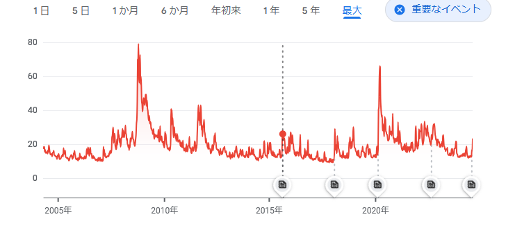 市場参加者の予想する今後30日間の株価変動の大きさを示している数値のこと。大きく動いている時は相場が暴落する時。特に株価が世界で同時に下落している時には大きく上昇しやすい。