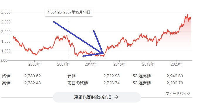 例えば2007年から2011年ごろには経済危機を理由として。TOPIXは下落傾向にありました。