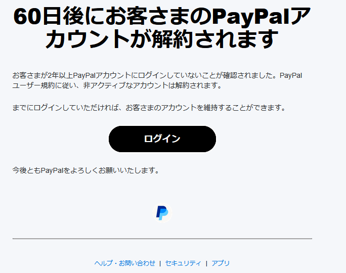 この通知は、PayPalアカウントが長期間使われていない場合の「非アクティブアカウント整理」の一環と思われます。